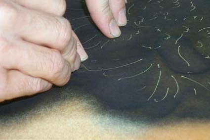 二枚の小刀を重ねて合わせて柄の細い線で輪郭を彫る「カチン摺り彫り」という技法です。