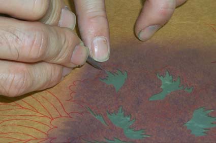 三枚から四枚の型紙で柄の輪郭のすべてを彫るという高度な技術を要します。